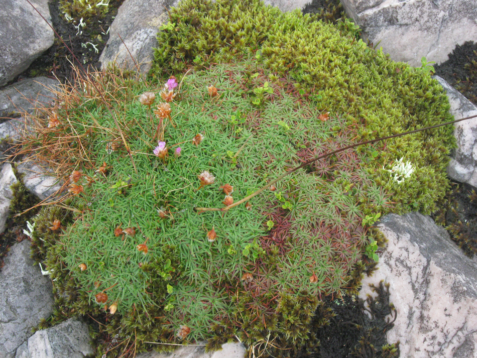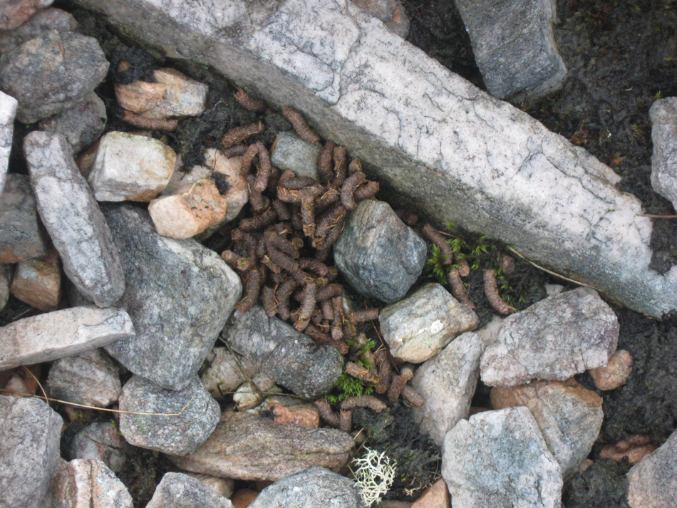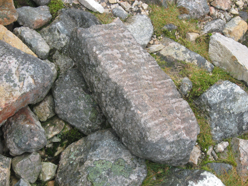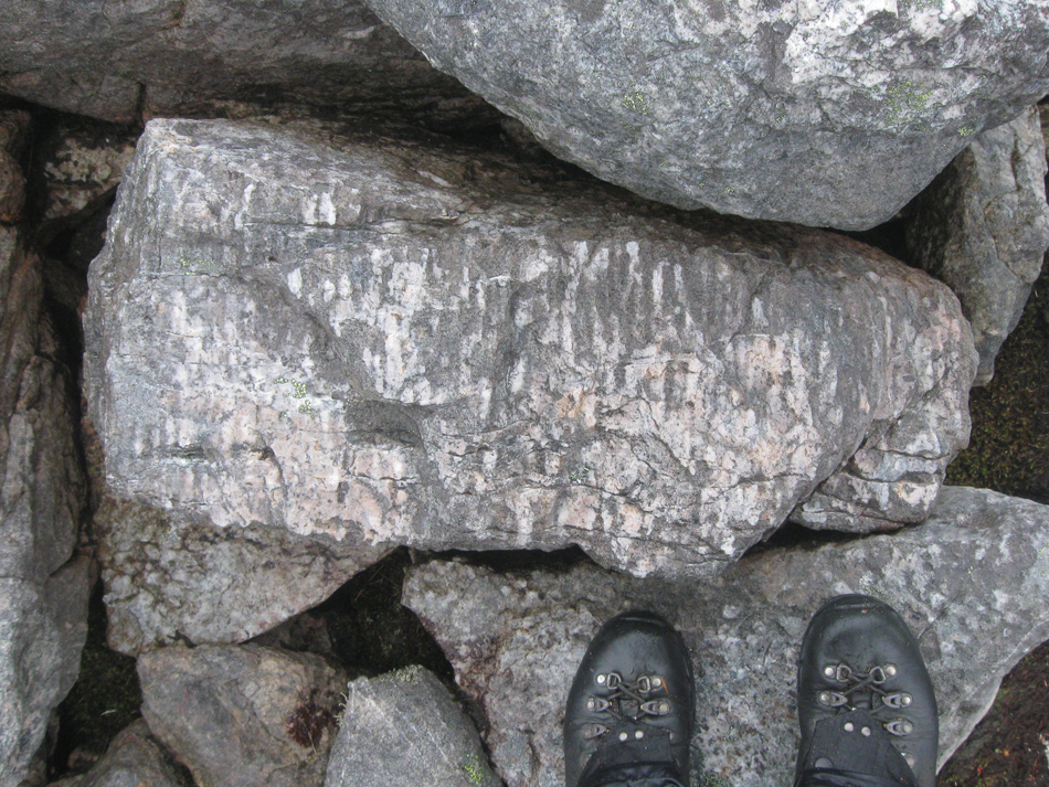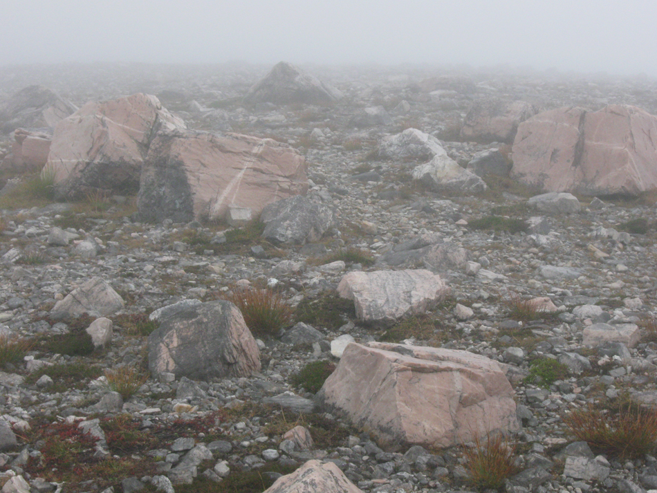 I was quite happy just looking at some geological literature I’d got at the bookshop at Inverkirkaig, but eventually B persuaded me that we should get out and walk. Sigh. We walked up a path and then up the steep slope on the western flank of Glas Bheinn. The cloud base was quite low, so we were in mist by the time we got to the shoulder of the north-west ridge we had gone up. We used the opportunity to practice a bit of navigation, as the top of Glas Bheinn is quite wide. We walked across quite a lot of pinkish quartzite, and there was a lot of pipe rock at the summit. We saw ptarmigan and grouse.